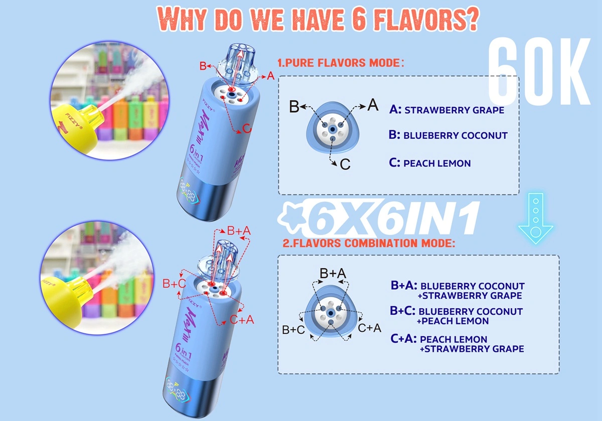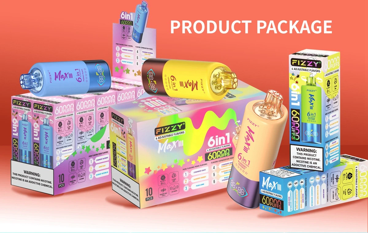 Fizzy MAX III 60000 Puffs 6-in-1 Tek Kullanımlık Vape, altı aroma seçeneği, yüksek puff sayısı ve güçlü bataryası ile tek kullanımlık cihaz kullanıcıları arasında öne çıkar. Tat ve buhar performansını ön planda tutan yanı ile beklentilerinize cevap verecek bir modeldir.
