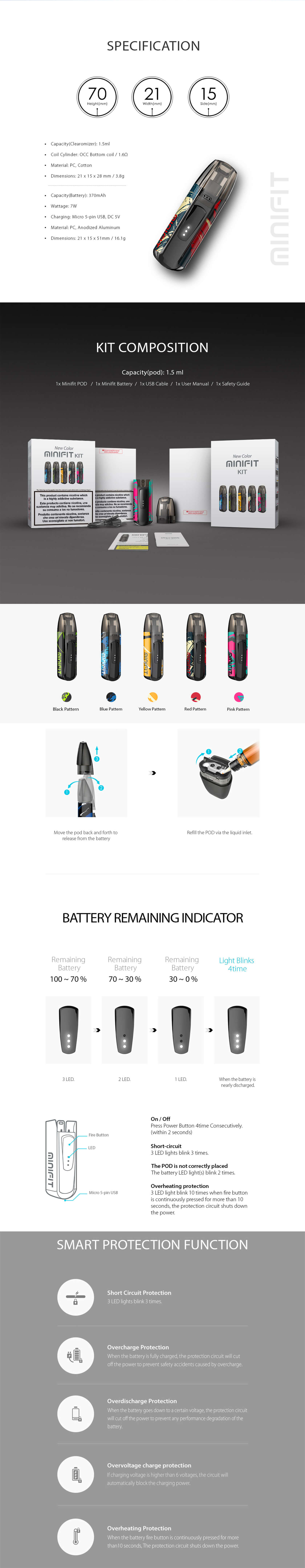 Justfog Minifit Pod Mod, gelişmiş güvenlik özellikleriyle donatılmıştır. Kısa devre koruması, aşırı şarj koruması ve düşük voltaj koruması gibi güvenlik önlemleri, içim sırasında güvenli bir deneyim sağlar. Hafif ve dayanıklı yapısıyla günlük kullanıma dayanıklıdır, aynı zamanda pratik bir çözüm sunar.