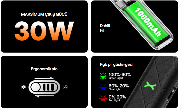 • Uyumlu direnç seçenekleri: 0.4 Ohm, 0.6 Ohm, 0.8 Ohm, 1.2 Ohm pod’lar — farklı çekim stillerine uygunluk.