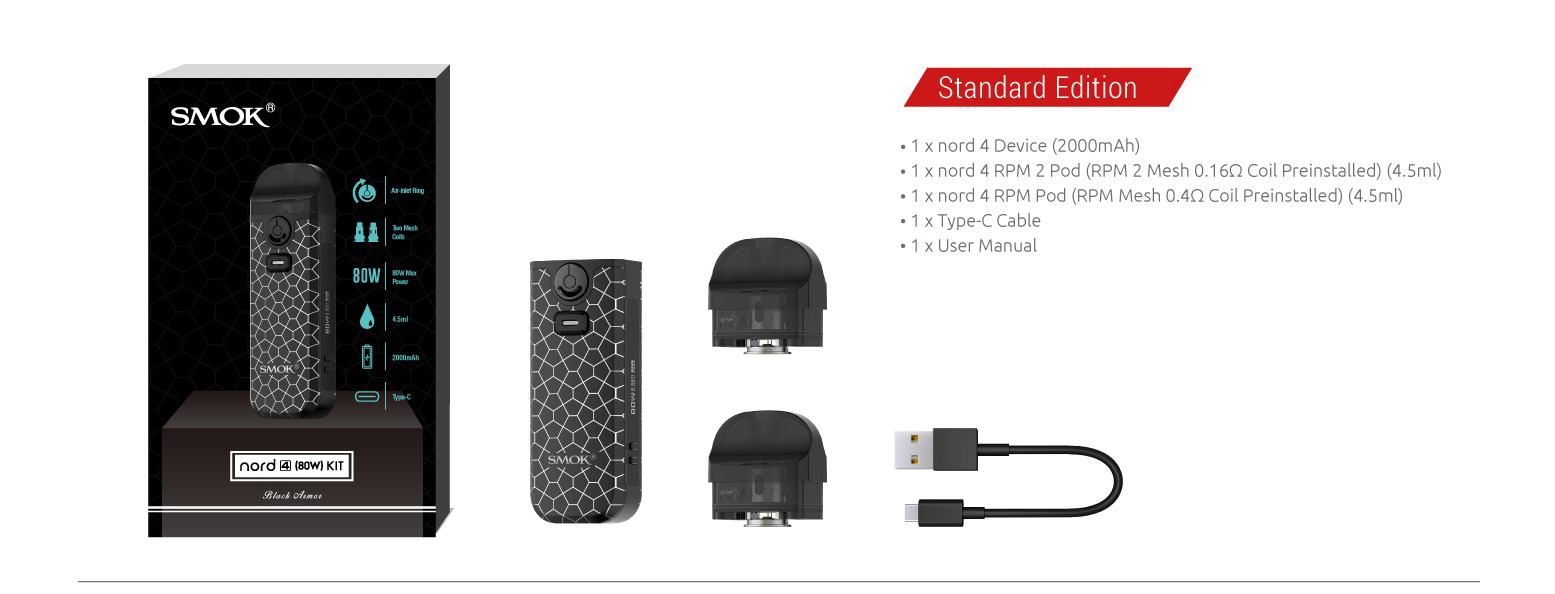 Smok Nord 4, Nord serisinin yeni üyesiyle vaping deneyimini bir üst seviyeye taşıyor. İçinde 2000mAh batarya bulunan Nord 4, 80W maksimum güç sağlar. Kiti, iki farklı pod ile birlikte gelir: RPM 2 Pod ve RPM Pod, her ikisi de çeşitli coil seçenekleri sunar. Yenilikçi hava akımı sistemi, lezzet ve buhar miktarını optimize eder. Şık ve ergonomik tasarımıyla dikkat çeker. Nord 4, kullanıcıların elektronik sigara deneyimini özelleştirmesine imkan tanır.