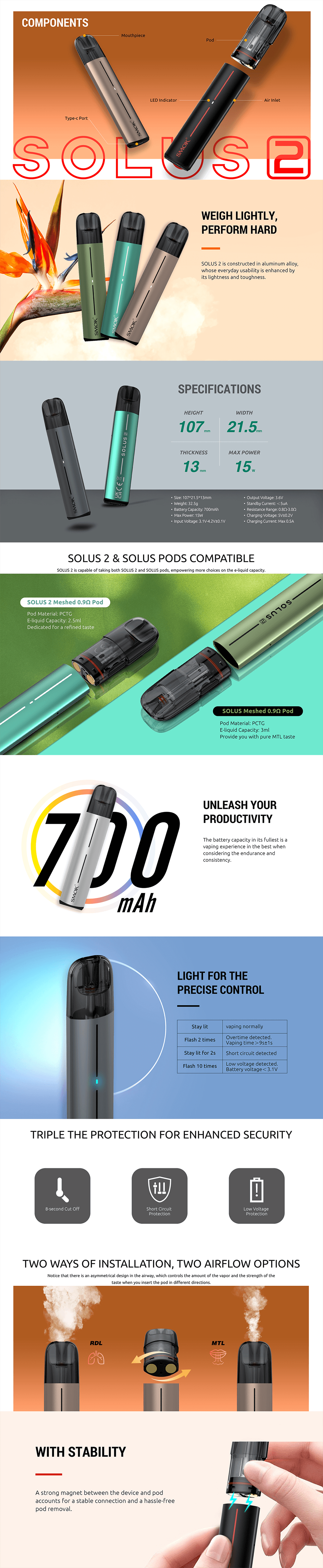 Smok Solus 2 Pod Mod, dahili 700mAh bataryası ve maksimum 15W çıkış gücü ile uzun süreli buharlama deneyimi sunar. Çift hava akışı tasarımı, kartuşun yönünü değiştirerek hem DL (Doğrudan Ciğere) hem de MTL (Ağızdan Akciğere) içim seçenekleri sağlar. Kompakt ve kullanımı kolay yapısıyla öne çıkan cihaz, 0.9 Ohm mesh coil ile lezzetli ve yoğun buhar üretimi sunar.