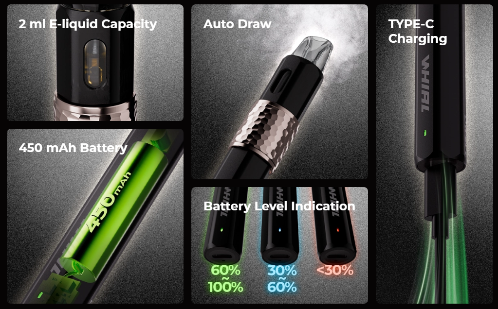 • Dual ateşleme modu: inhale ile ve butonla — kullanıcı tercihlerine uygun