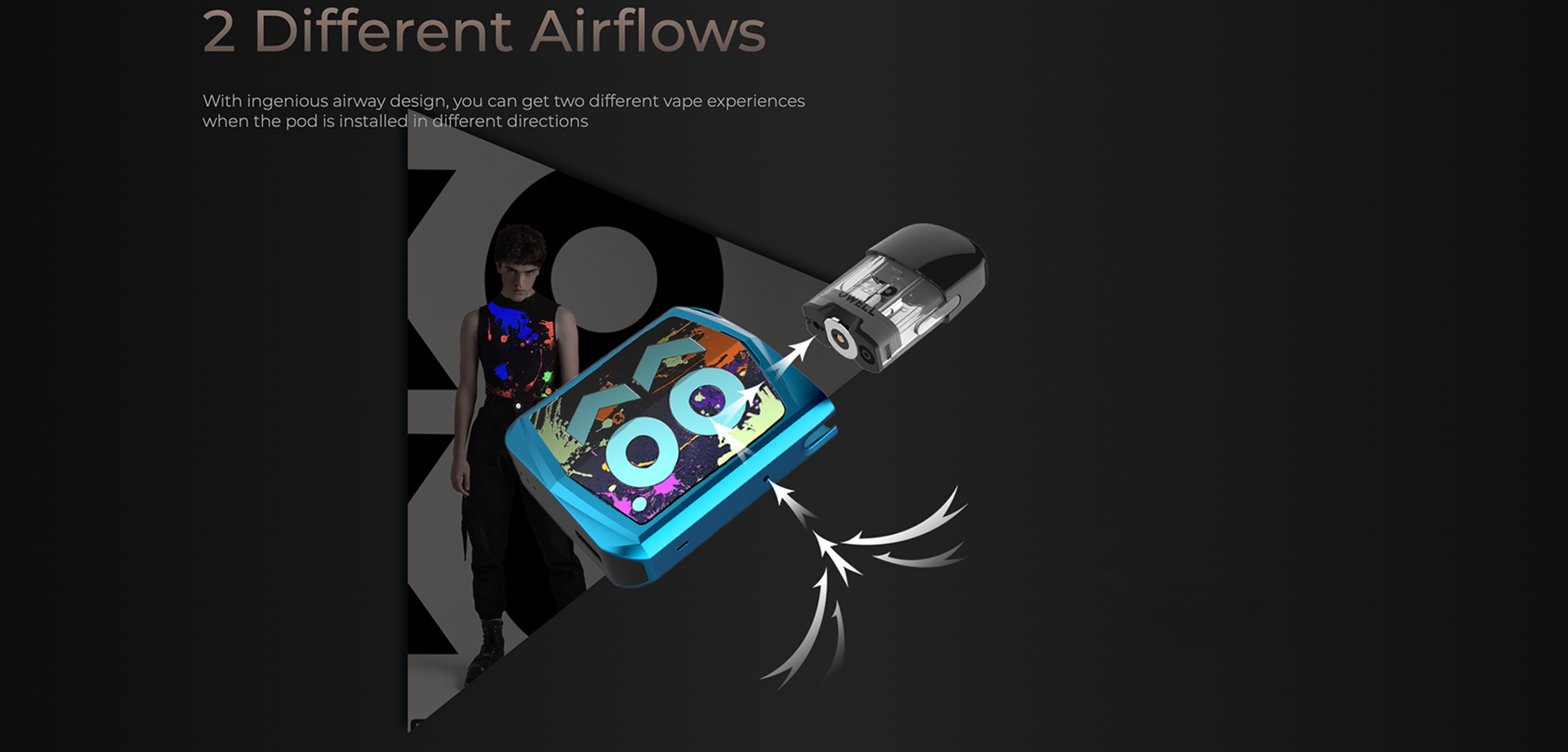 Cihazın yan tarafında bulunan panelleri tercih ettiğiniz stile dönüştürme imkanı ile dayanıklı PCTG malzemeden üretilmiştir. Ek olarak, bu cihaz, yerleştirilen bobinin daha sıkı veya daha gevşek bir vape olacak şekilde döndürülmesiyle değiştirilebilen çift hava akımı sistemine sahiptir. Bu cihazı etkinleştirirken herhangi bir düğme yoktur, tek yapmanız gereken nefes almaktır.