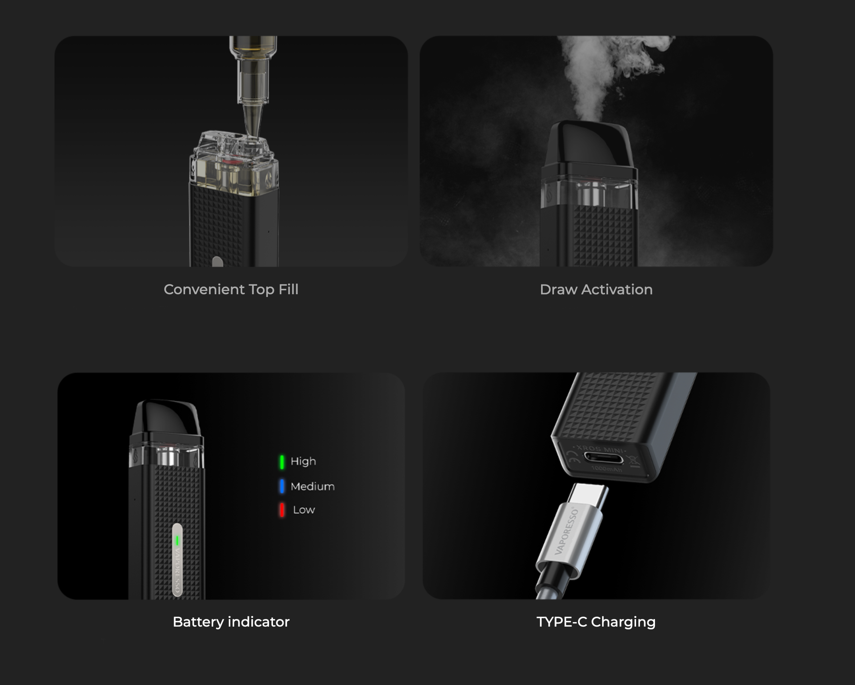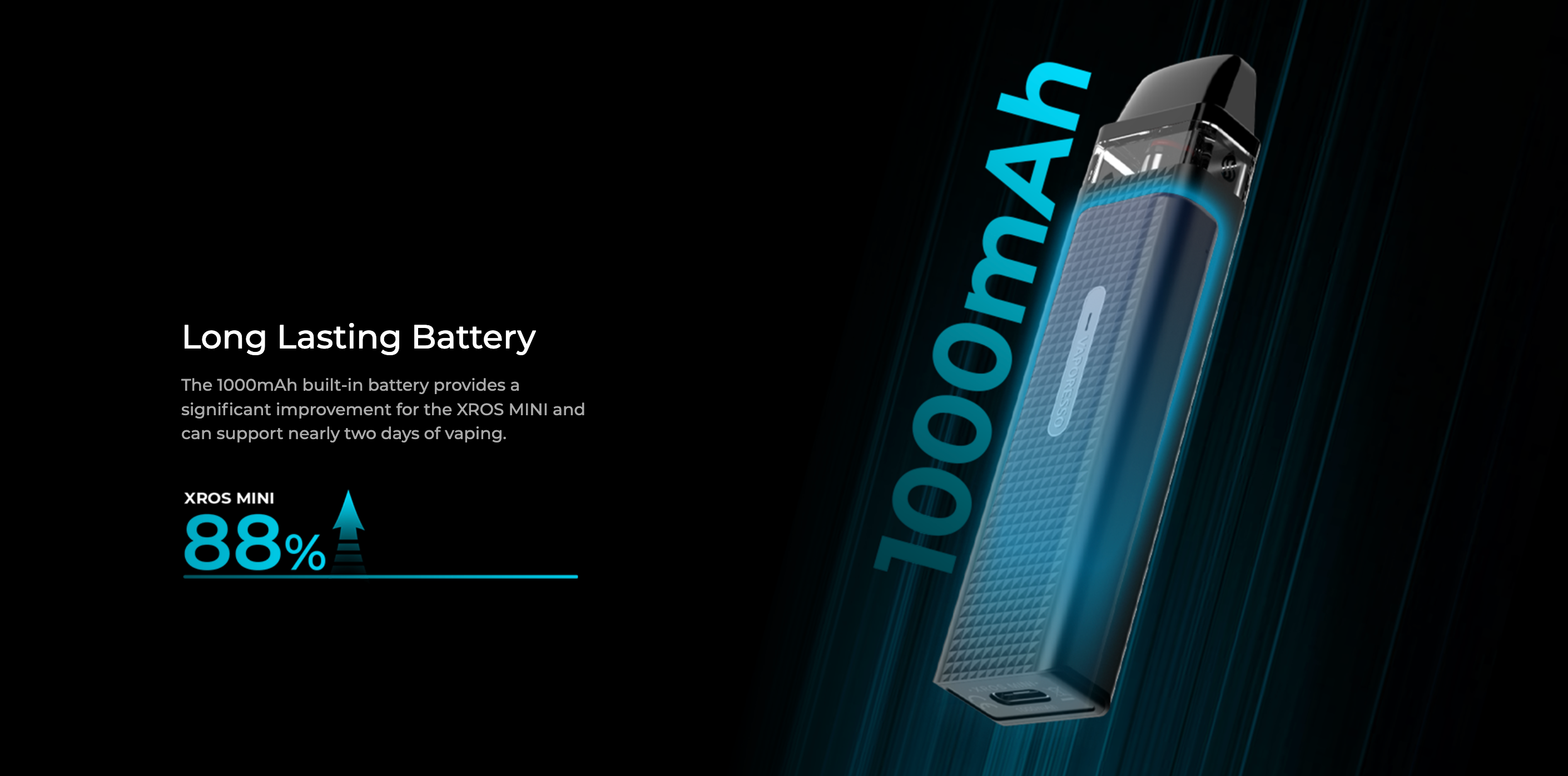 Vaporesso XROS Mini Pod,  cihaz, 1000mAh yerleşik pil kapasitesine sahip olup, yaklaşık 2 günlük kullanım süresi sunar.
