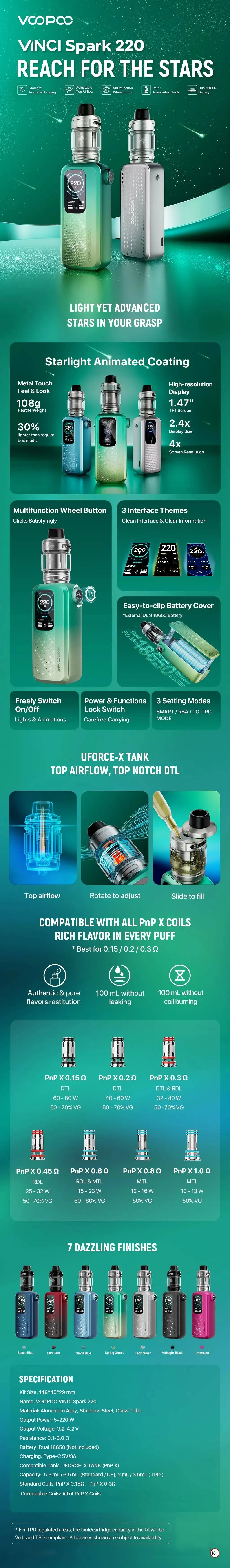 Voopoo Vinci Spark 220, 220W'a kadar güç sunan hafif ve şık bir pod mod cihazıdır. Yıldızlı animasyonlu ekranı, GENE.TT 2.1 çipseti ve PnP-X coil uyumluluğu ile her içim stiline hitap eder. UFORCE-X Tank ve hızlı şarj desteğiyle uzun süreli kullanım sağlar.